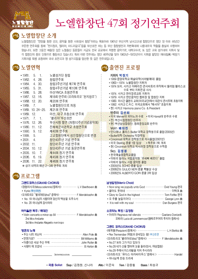 노엘 합창단 47회 정기연주회 페이지 정보 작성자 김석겸 작성일07-06-22 23:43 조회11,106회 댓글0건 관련링크 이전글 다음글 수정 삭제 목록 본문 초청합니다. 댓글목록 등록된 댓글이 없습니다. 이전글 다음글 수정 삭제 목록