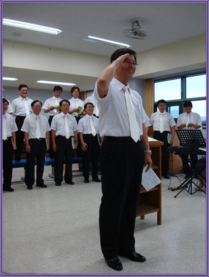 합창단소개시간- "충성" 군대식으로 인사하는 총무 한지수장로님