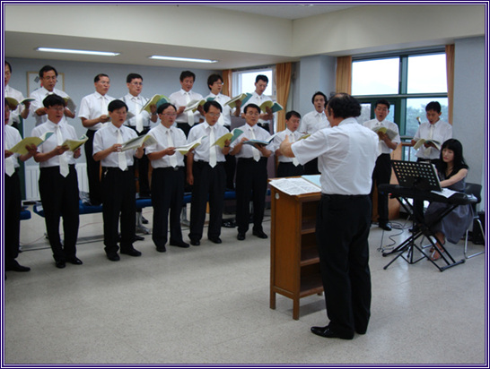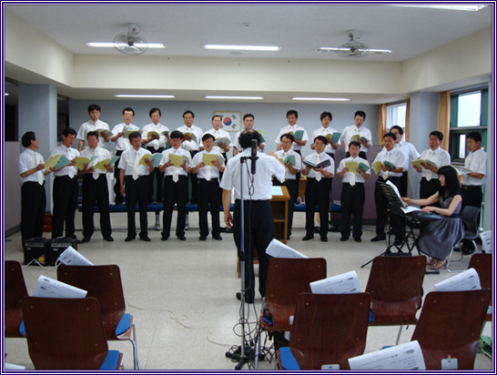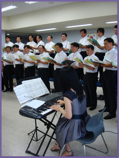 비는 오죠, 교회건물지붕이 부실하여 새로신축한 HQ3층에 급히 마련한 장소에서 피아노대신 키보드로 반주하느라