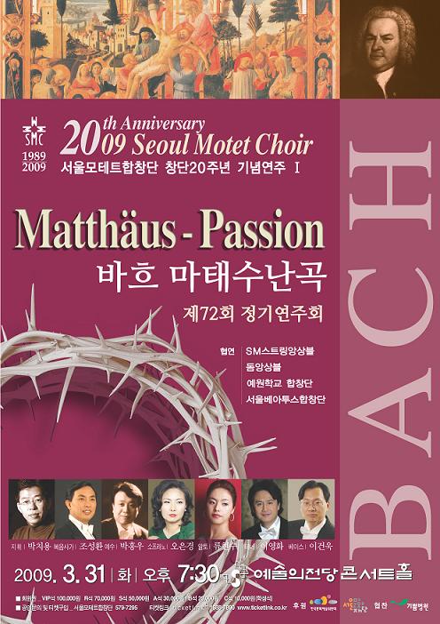 올해로 창단 20주년(1989~2009)을 맞이하는 서울모테트합창단은 오는 3월 31일(화) 오후 7시 30분 예술의전당 콘서트홀에서 창단 20주년을 기념하는 첫 번째 음악회로 요한 세바스찬 바흐의 수난곡인 마태수난곡(Matthäus Passion)을 연주한다.