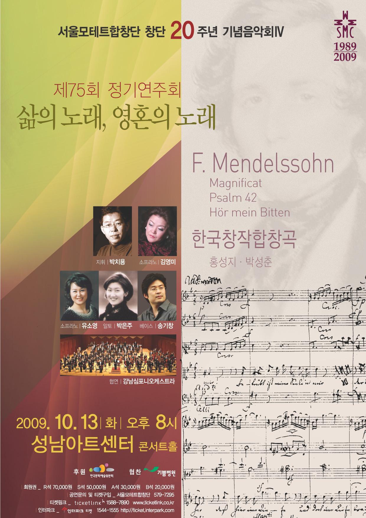올해로 창단20주년을 맞이하는 서울모테트합창단은 기념음악회시리즈 네 번째로 탄생200주년을 맞이한 멘델스존의 합창음악명곡과 한국창작합창음악으로 꾸며진다. 합창음악과 교회음악 역사에서 빼놓을 수 없는 중요한 작곡가인 멘델스존은 바흐를 중심으로 한 이전의 대가들의 작품 연구와 연주를 통해 전통적 작곡기법과 낭만의 자유로운 조화를 이루어낸 훌륭한 작품을 많이 남겼다. 즉 ‘낭만적 고전주의’라는 표현이 가능하게 하는 멘델스존의 자유로운 음악적 흐름과 단아한 형식은 그의 음악에서 잘 나타나 있으며 특히 합창곡에 이와 같은 특징들이 두드러지게 나타난다. 멘델스존은 유대인 집안에서 태어났으나 루터교로 개종하고 , 오라토리오 ‘엘리아’ ‘사도바울’ ‘시편 칸타타등 많은 교회음악을 남겼다. 이번 서울모테트합창단의 정기연주회에는 Magnificat(한국초연), Psalm42 op.42 “Wie der Hirsch schreit(사슴이 시냇물을 찾듯이)” “Hör mein Bitten(나의 간구를 들으소서)"Psalm55을 연주한다. 풍부한 화음과 아름다운 선율로 멘델스존 합창음악의 위대한 자산 중 하나라고 불리는 이번 작품에는 최고의 소프라노 김영미(한국예술종합학교 교수)가 협연한다. 소프라노 김영미의 뛰어난 가창력과 영혼을 울리는 음악성 그리고 서울모테트합창단의 넘치는 배음과 아름다운 하모니는 듣는 모든 사람에게 벅찬 감동을 주게 될 것이다. 또한 한국 초연되는 Magnificat에서는 20주년을 기념하여 단원출신성악가 소프라노 유소영(경북음대 교수) 알토 박은주 베이스 송기창(경원대 겸임교수)이 협연한다. 꾸준히 한국창작음악에 대한 관심으로 한국창작합창곡 연주를 해온 서울모테트합창단은 이번연주회에 유럽을 중심으로 매우 활발히 활동하며 국내보다 외국에서 더 큰 명성을 얻고 있는 작곡가 홍성지 작품과 국내 중견 작곡가로 활발한 활동을 하는 박성춘 작품을 연주한다. 멘델스존의 탄생200주년이 되는 뜻 깊은 해이기도 한 2009년10월 서울모테트합창단이 들려주는 합창음악의 진수를 만끽하는 훈훈한 초가을 저녁이 될 것이다.